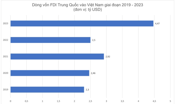 Đơn cử như trong năm 2023, Tập đoàn sản xuất tấm quang năng Jinko Solar Holding của Trung Quốc đã rót 1,5 tỷ USD đầu tư vào dự án tổ hợp công nghệ tế bào quang điện tại Quảng Ninh. Hay như Tập đoàn Runergy xây nhà máy vật liệu bán dẫn 293 triệu USD ở Nghệ An. Tập đoàn BYD, hãng xe điện lớn nhất Trung Quốc, cũng đã đầu tư 269 triệu USD vào dự án về linh kiện ô tô tại tỉnh Phú Thọ.